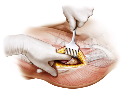 إن النهج الأمامي الجانبي الأقل بضعاً (الجانب الأمامي) لمفصل الورك، والذي يُطلق عليه أيضًا "نهج فيسبادن"، لا يؤدي إلى إصابة العضلات المحيطة.