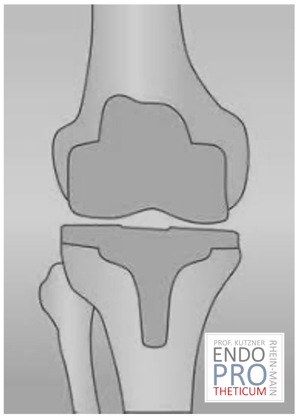 La articulación de rodilla artificial reemplaza la superficie del cartílago destruida por la osteoartritis. El hueso subyacente del fémur y la cabeza tibial permanece intacto. Algunos comparan una articulación artificial moderna de rodilla con la coronación de un diente; el término exacto es el llamado rejuvenecimiento bicondilar. Entre las nuevas superficies de la parte superior e inferior de la pierna se encuentra la llamada incrustación de un plástico blanco especialmente endurecido, que en la imagen de rayos X se puede ver como la distancia entre las piezas metálicas.