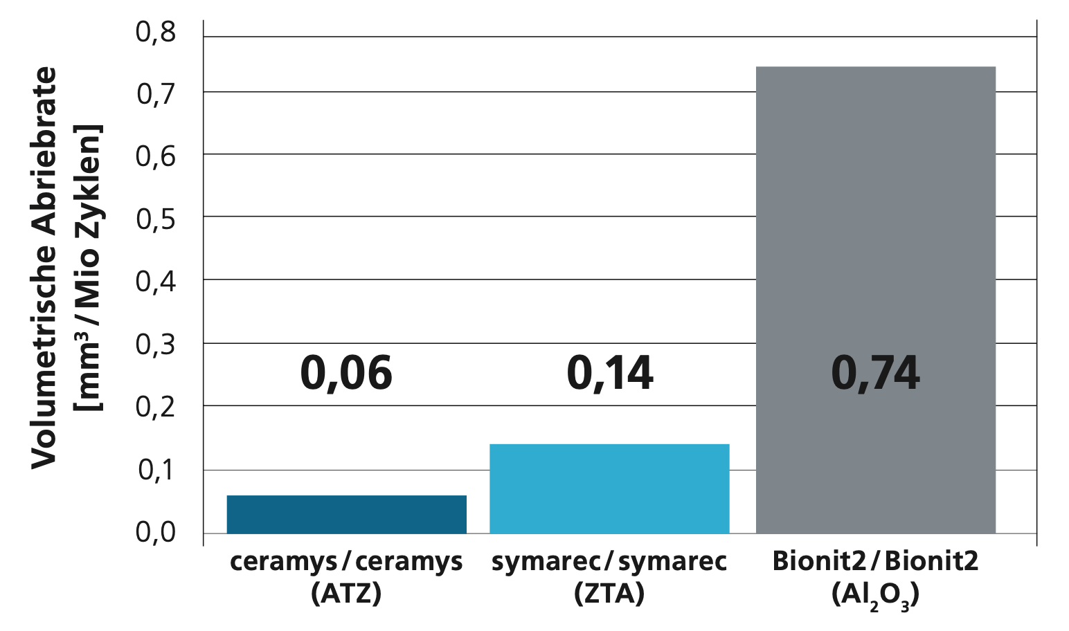 Die Qualität medizinischer Keramiken und die bessere Benetzbarkeit reduzieren den Abrieb gegen konventionelles Polyethylen auf 1/10. Bei hochvernetztem Polyethylen minimiert sich der Abrieb noch weiter. Der noch größere Vorteil bei Keramik-Keramik Gleitpaarungen in punkto Abrieb wird durch die Notwendigkeit eines rigiden PfannenimplantateS negativ beeinflusst. Auch sind selten Keramikbrüche und ein Quieken möglich.