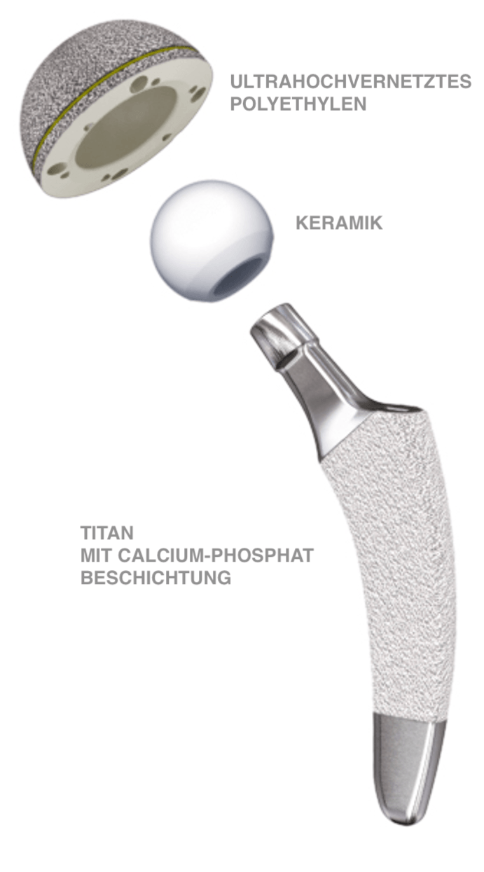 ZEMENtfreie HüftSchäfte sind in der Regel aus Titan hergestellt. Allergien oder Unverträglichkeiten sind hier nicht bekannt. Mit Hilfe einer Titan Plasma Spray Beschichtung sowie einer Kalzium Phosphat Beschichtung wird das Anwachsen des Knochens an den Schaft in den ersten Wochen nach der Operation erreicht.
